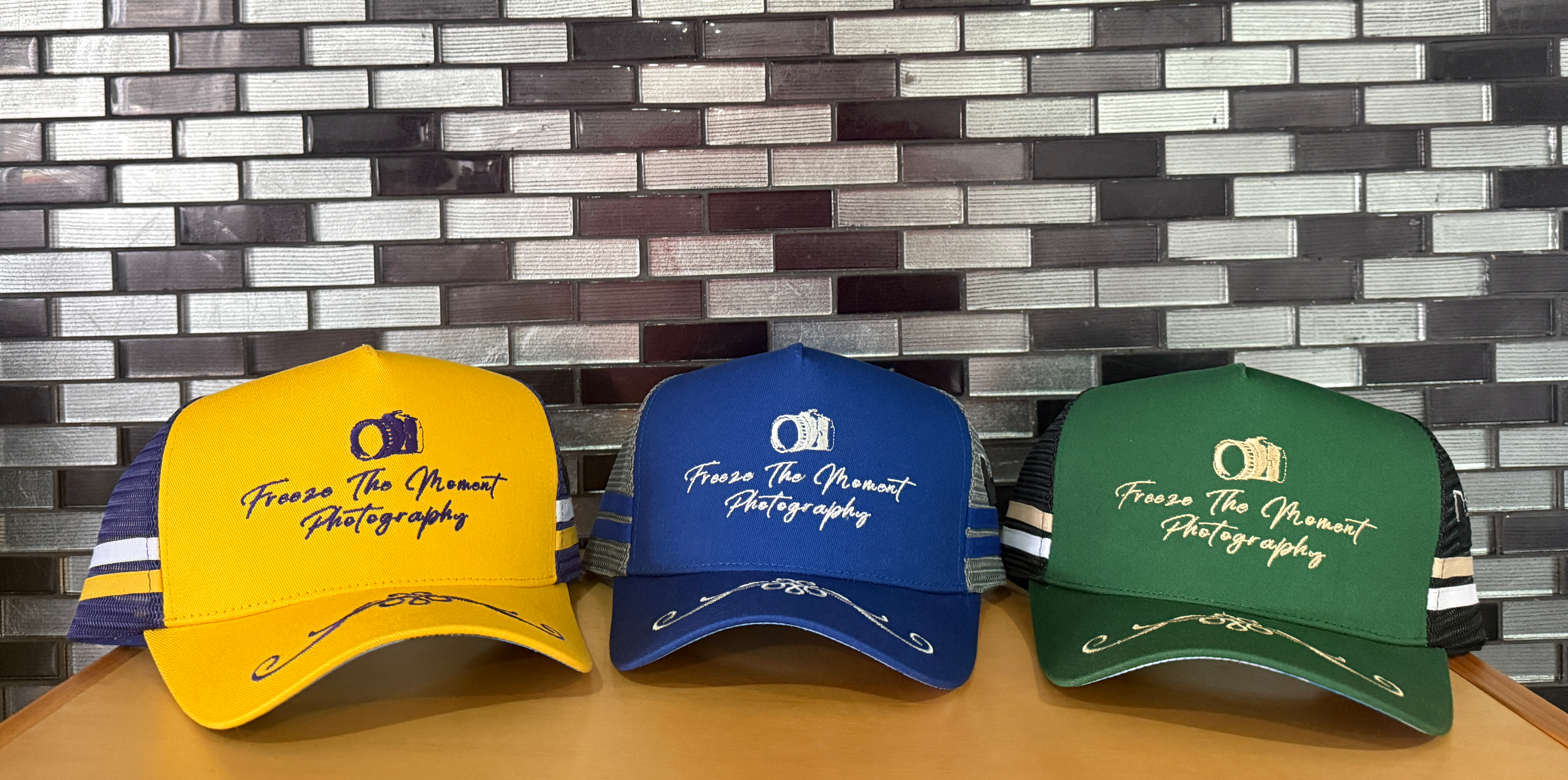 Freeze The Moment Photography Trucker Hat (Green & Gold)
